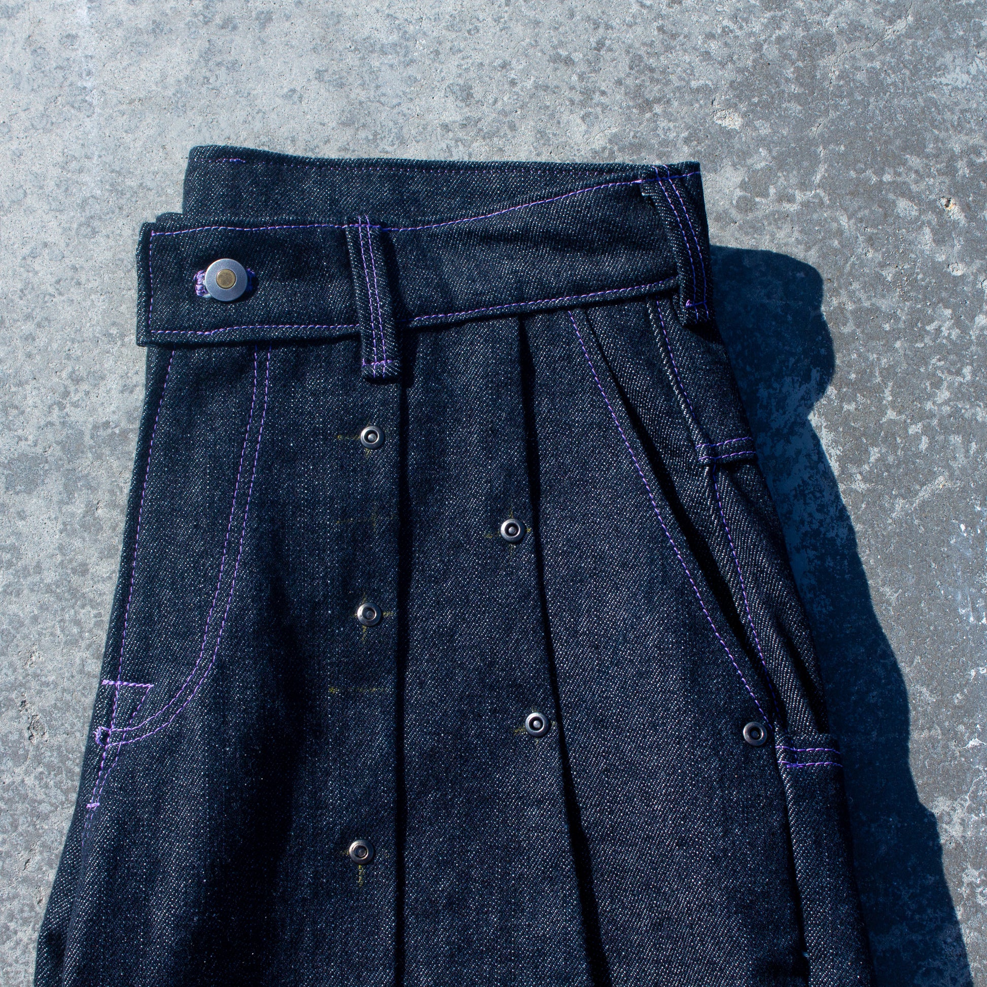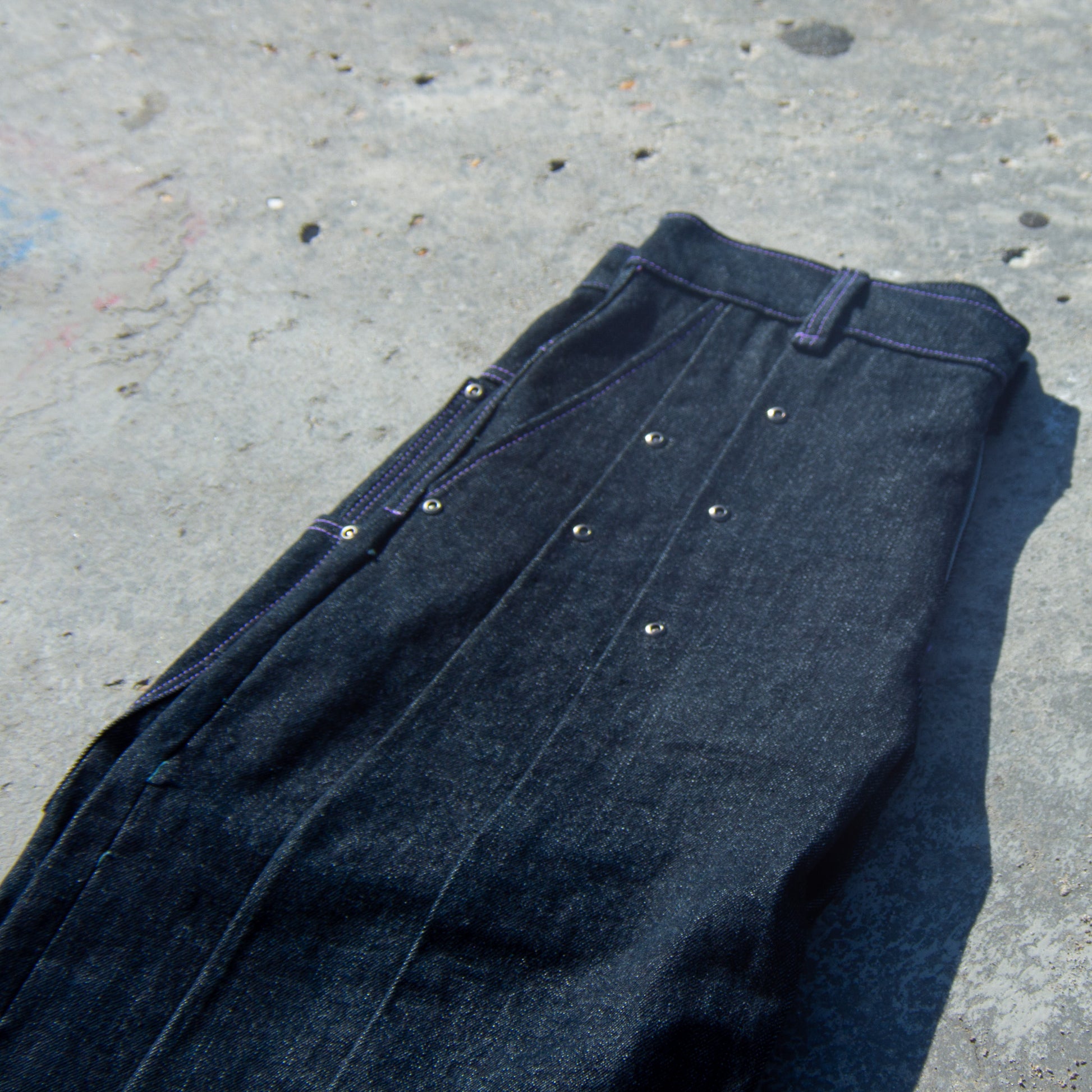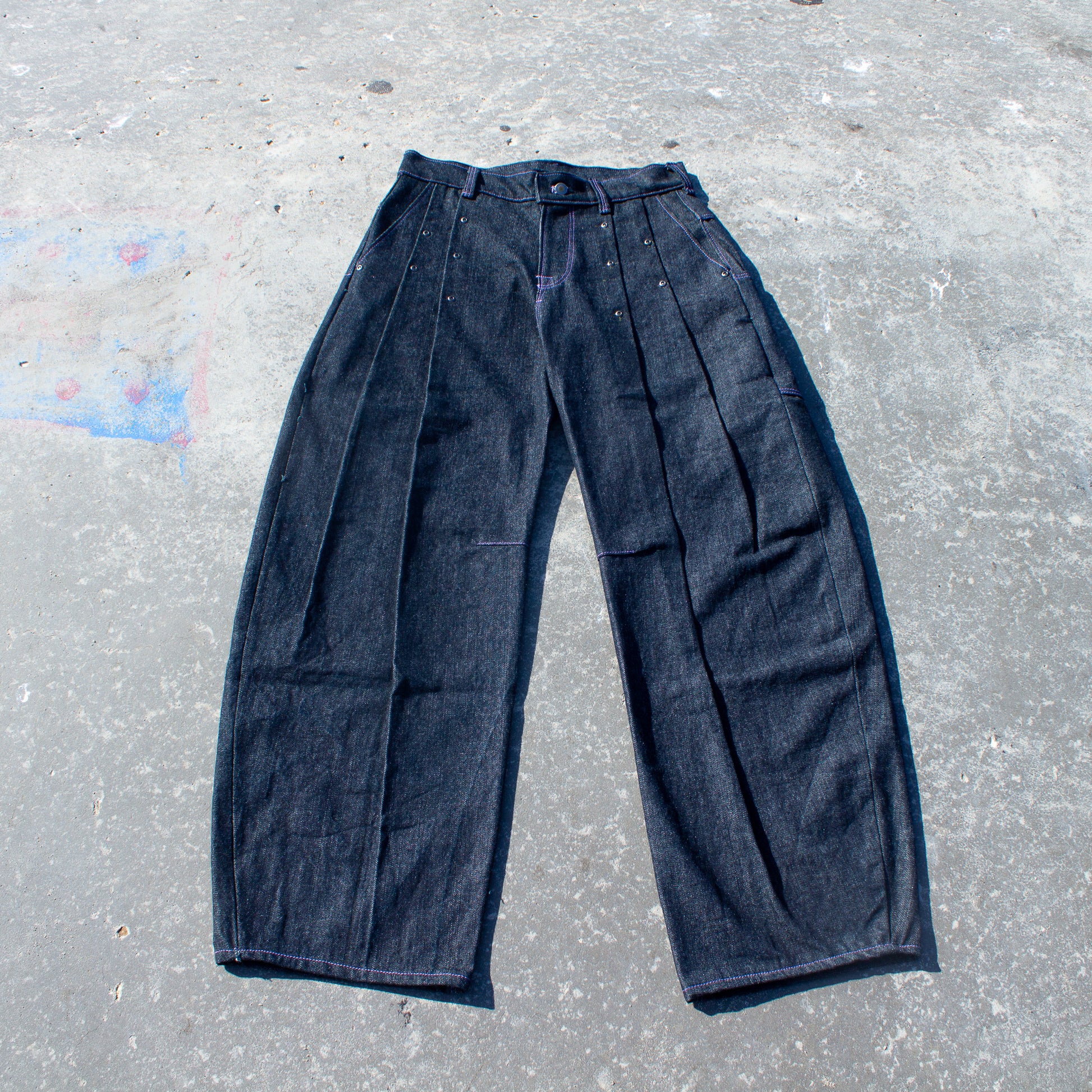 Made from a 100% cotton, 12oz dark indigo denim from Mt. Vernon Mills U.S.A plant. This loose weave, slubby denim allows for a beautiful drape, while the double pleats and darted knee's bring structure to the silhouette.